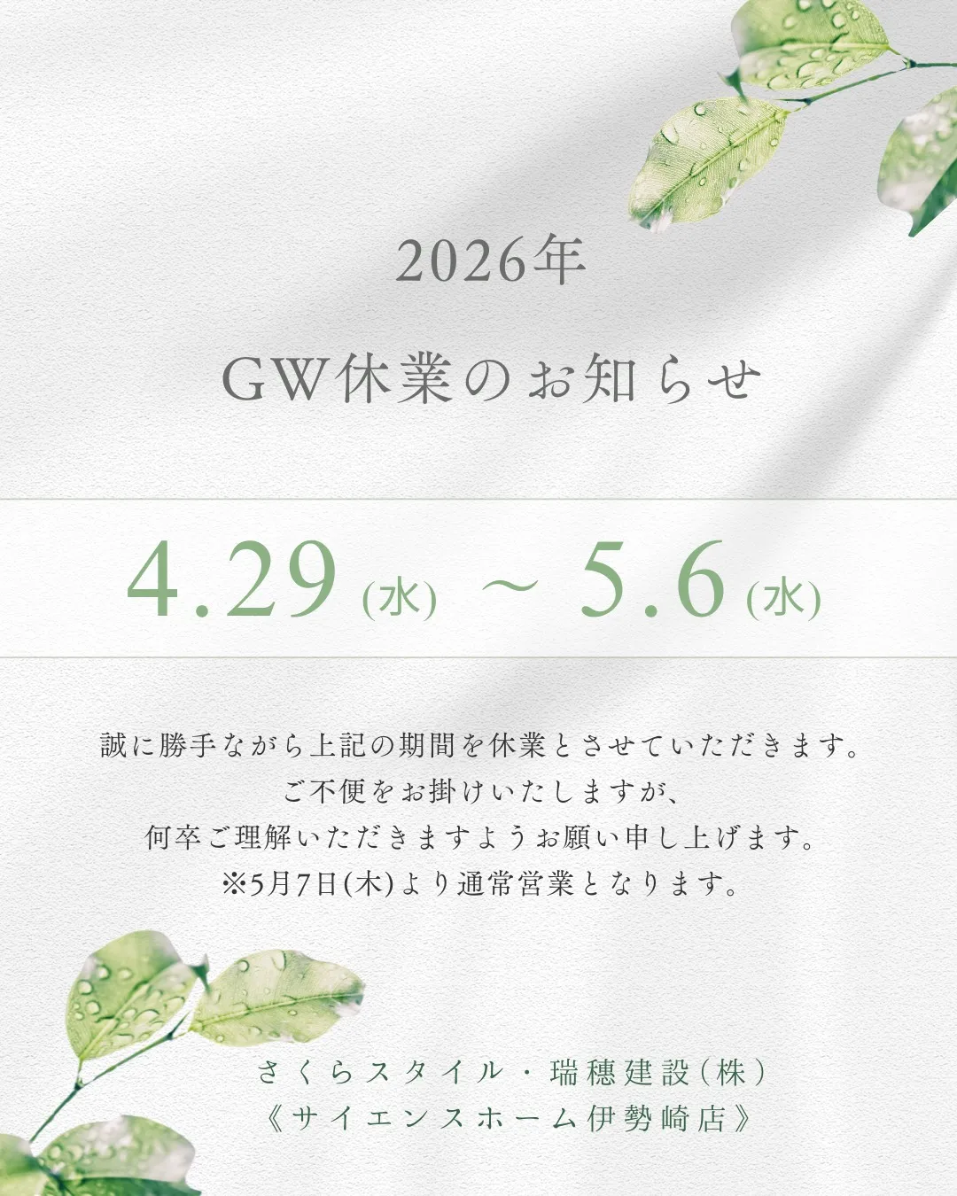 さくらスタイル🌸瑞穂建設《サイエンスホーム伊勢崎店》は下記の期間お休みをいただきます。